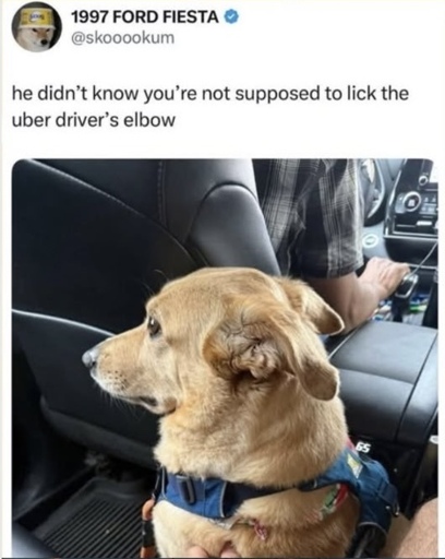 A Twitter post by 1997 FORD FIESTA @skooookum that reads “he didn’t know you’re not supposed to lick the uber driver’s elbow”. The attached picture shows a dog in the backseat of a car looking awkward.