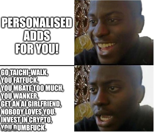 But as I already said, it only works in a dream. On TV or on billboards, you only see the huge budget ads. Coca-cola et al. But on the web with targeted ads, you get spam ads. So many fake products, scam websites, get-rich-quick schemes, etc etc, that the advertising space itself is devalued because just by having your name there you look like a scammer.