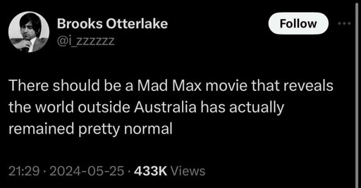 ☆ Yσɠƚԋσʂ ☆@lemmy.ml to Share Funny Videos, Images, Memes, Quotes and more @lemmy.mlEnglish · 19 days agoNew Mad Max movie conceptlemmy.mlimagemessage-square9linkfedilinkarrow-up162arrow-down12
