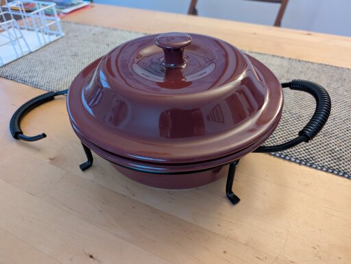 I would like to repair it, but I am not very knowledgeable of metal work, The goal is that it becomes usable again with the casserole (and food inside!) so I am looking into a sturdy and durable fix. What would be the best way to fix it? epoxy? soldiering? any recommended technique?
