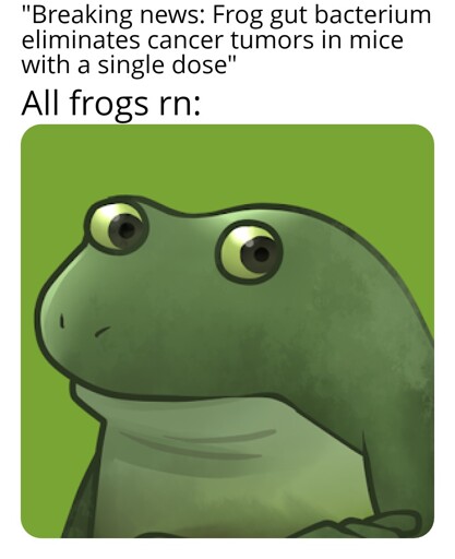 titty_wizard@lemmy.world to memes@lemmy.world · 2 months agoFrogIRLlemmy.worldimagemessage-square43linkfedilinkarrow-up1622arrow-down17file-text