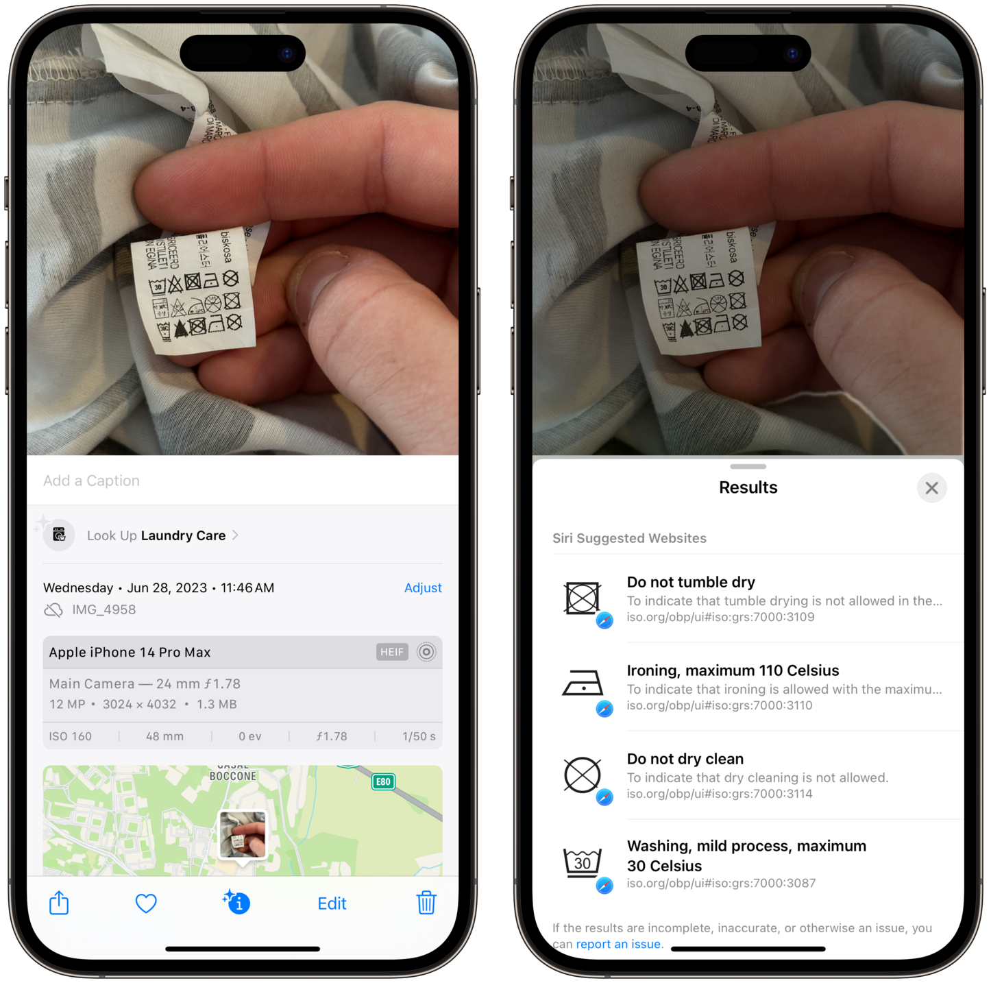 iOS 17's Photos app can now identify *and* explain laundry symbols in pictures and this is amazing. No more need for apps that do this; just swipe up on a photo.