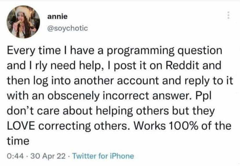 AgreeableLandscape@lemmy.mlM to Programmer Humor@lemmy.ml · 4 years agoWorks every time.lemmy.mlimagemessage-square10linkfedilinkarrow-up1201arrow-down15