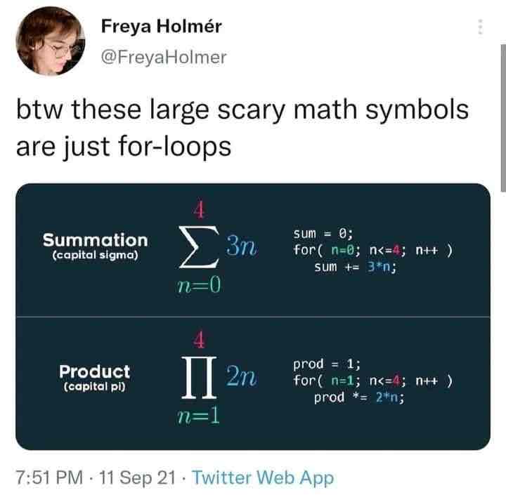 minus-squareInky@lemmy.calinkfedilinkarrow-up1·3 years agoThis post confuses me. Why would code be simpler than the math notation? Both involve symbolic abstraction of basically the same complexity