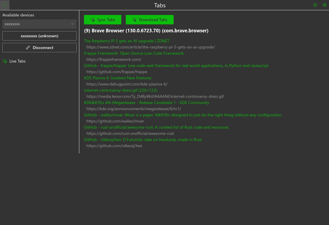 View live tab sessions from browsers on an android phone, save them locally as json or sync them to server