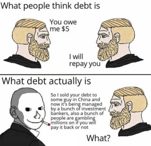 While funny, and this is a the meme community, God it’s so much worse than that. Debt accumulated in a western style capitalist society is just how money exchanges hands. Your debt, the one that deeply affects your life, that can ruin your ability to make basic purchases and health care is a simple gamble for the rich, OUR debts.