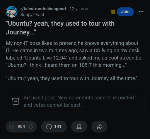 arrow-up1609arrow-down1imageUbuntu? Yeah, they used to tour with Journey all the time.lemm.eeTheImpressiveX@lemm.ee to linuxmemes@lemmy.worldEnglish · 1 year agomessage-square33linkfedilink