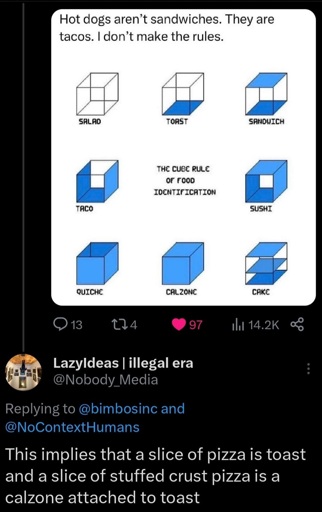 getoffthedrugsdude@lemmy.ml to Memes@lemmy.ml · 2 years agois a hot dog a sandwichlemmy.mlimagemessage-square6linkfedilinkarrow-up11arrow-down10