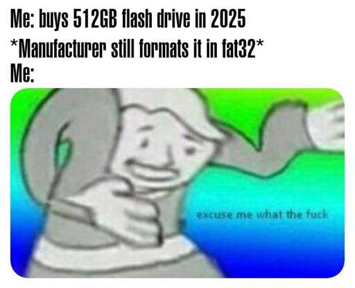 Yeah, I use a lot of legacy gear for work. They type of shit that is running Windows 98 embedded. Fat32 will never die as long as legacy support is a thing. If I plug an exFAT drive into one of those machines, it won’t even recognize the drive.