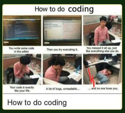 Stomata@sh.itjust.works to Memes@lemmy.mlEnglish · 9 months agoHow to codesh.itjust.worksimagemessage-square4linkfedilinkarrow-up1132arrow-down15 cross-posted to: memes@lemmy.world
