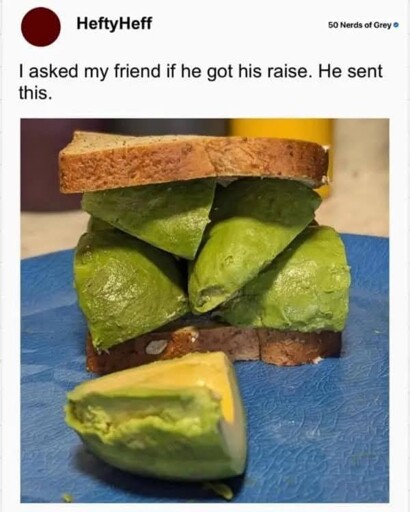 minus-squaremystic-macaroni@lemmy.mllinkfedilinkarrow-up30·4 months agoIs this a good sign or a bad one? Lots of avocado, but on sliced bread?