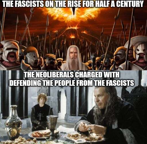 The Republicans are fascists, but the Neoliberal Democrats, all Democrats save 2-5 spoiler the DNC hates more than Republicans, are fascist enablers that play pretend that funnelling the value of the nation’s labor to the top few percent somehow won’t lead to fascism.